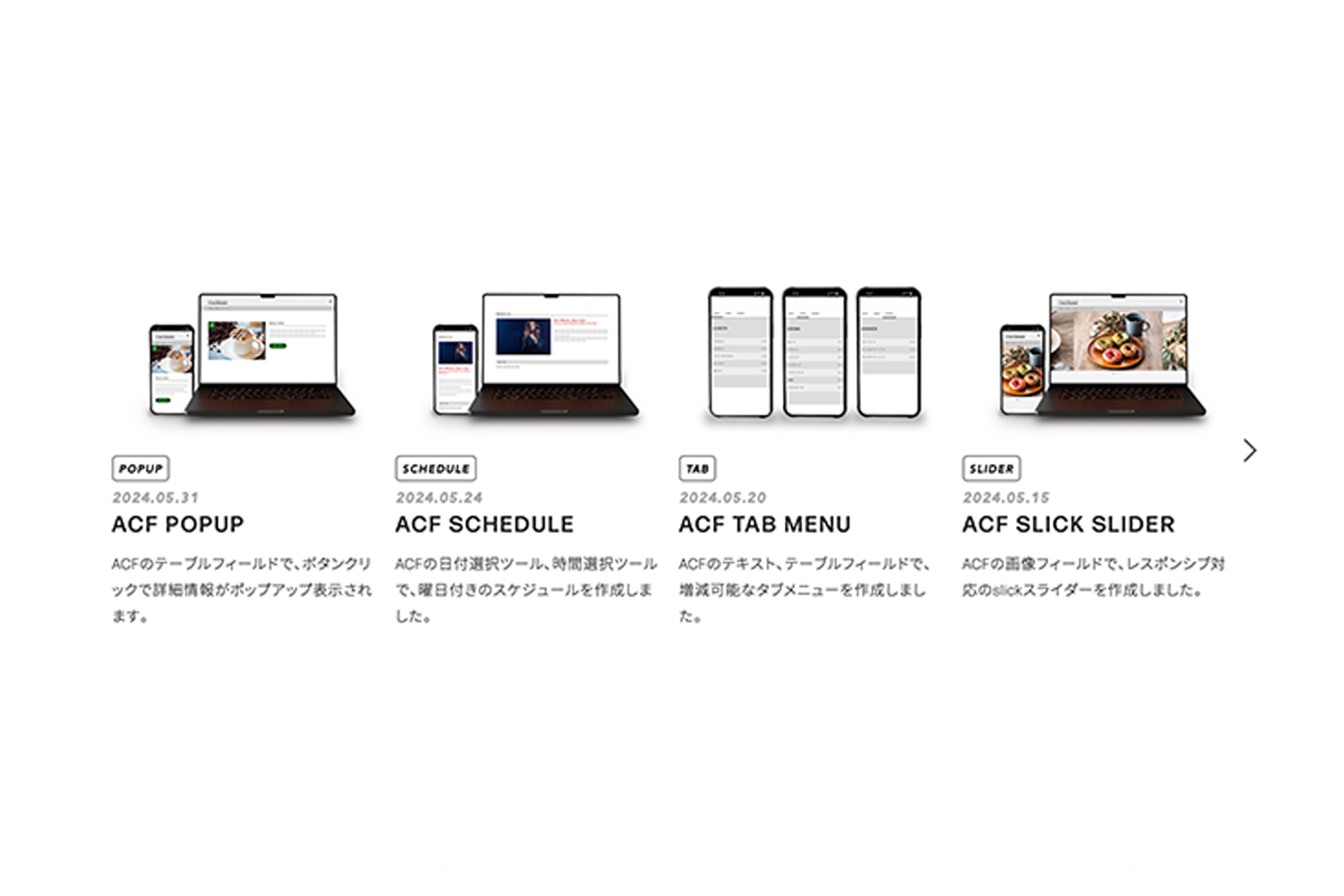• 当BLOGやDEMO等では、関連のある投稿を、RECOMMENDで表示しています。これは、ACF関係フィールドを使用しています。今回は、ACF関係フィールドで、関連投稿をslickのループ無しカルーセルで表示する方法を紹介します。