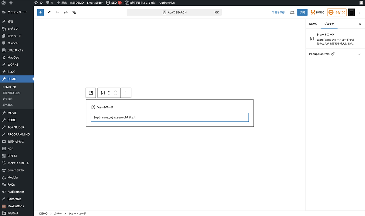 今回は、DEMO用にブロックエディターでシングルページに設置しました。通常は、Search shortcode fortemplatesのコードをPHPの設置したい場所に設置します。