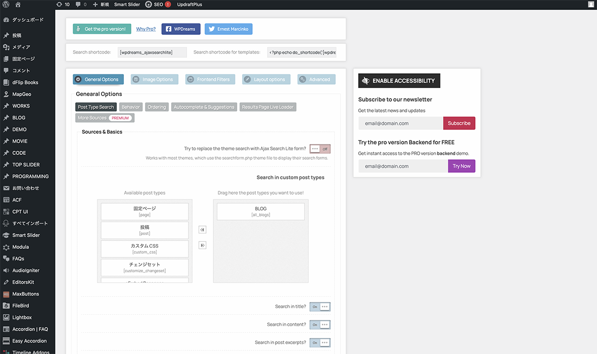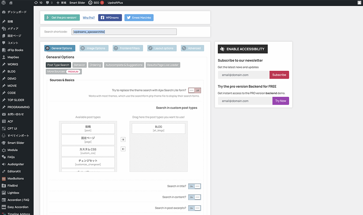 検索範囲にしたい項目を設定します。Sources & Basics>Available post typesの項目を右のDrag here the post types you want to use! にドラッグ&ドロップします。今回は、カスタム投稿タイプのBLOGのみ検索範囲に設定しました。
