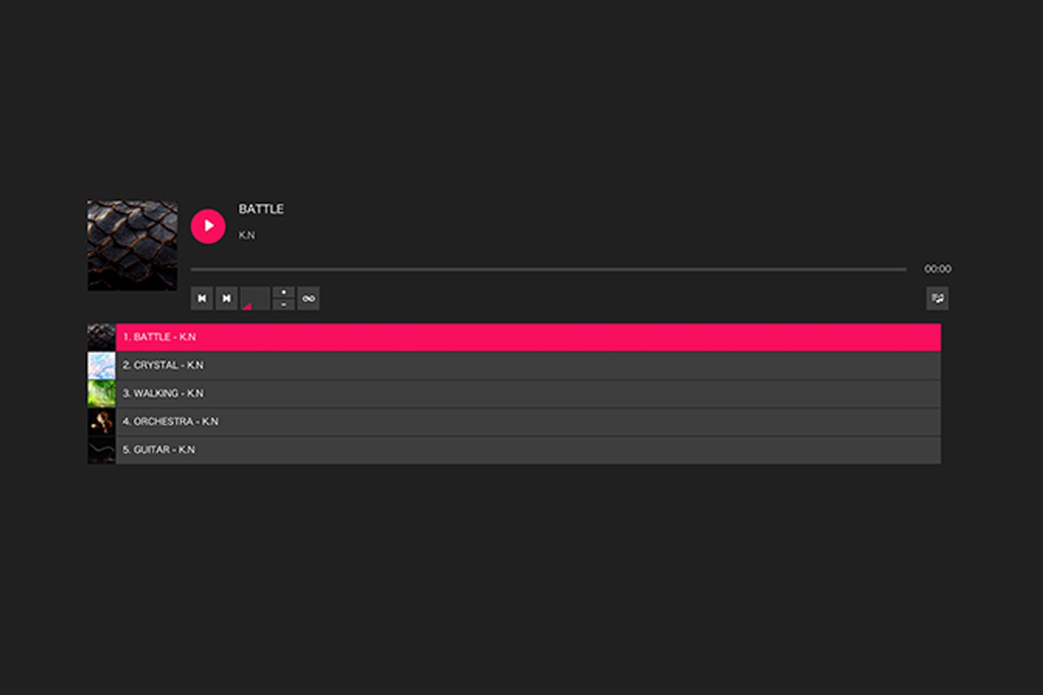 5曲の音楽をプレイリストにしました。再生、音量調整、オールリピート再生が出来ます。