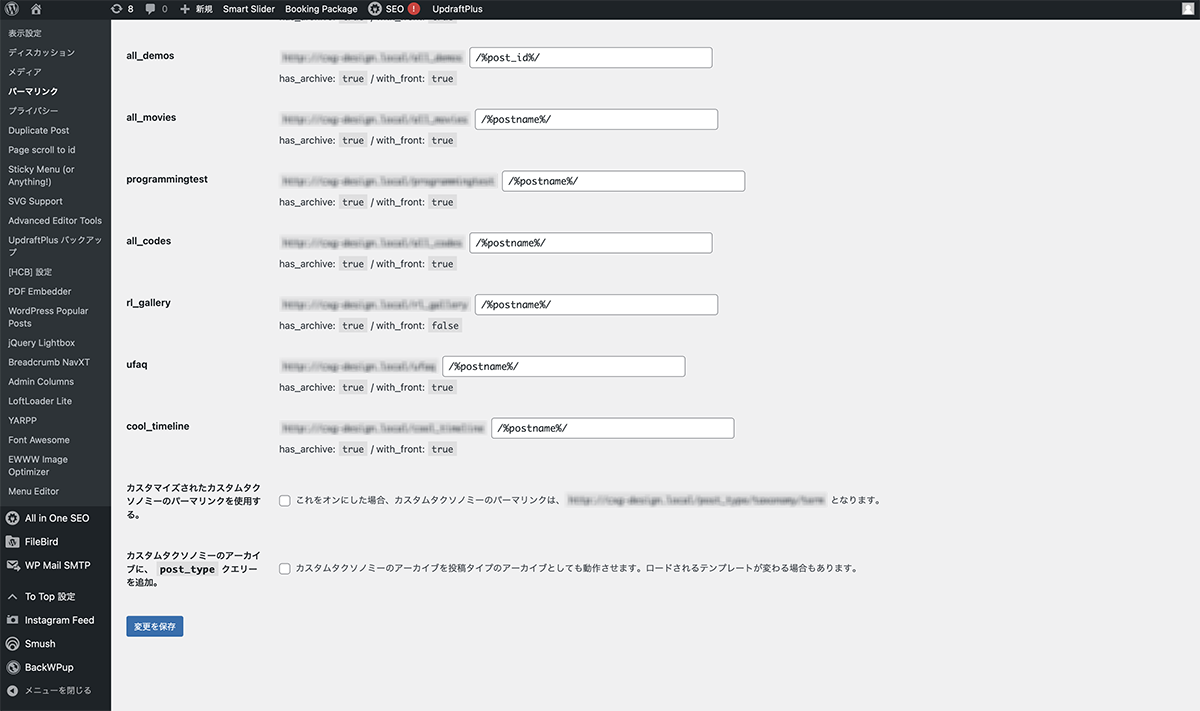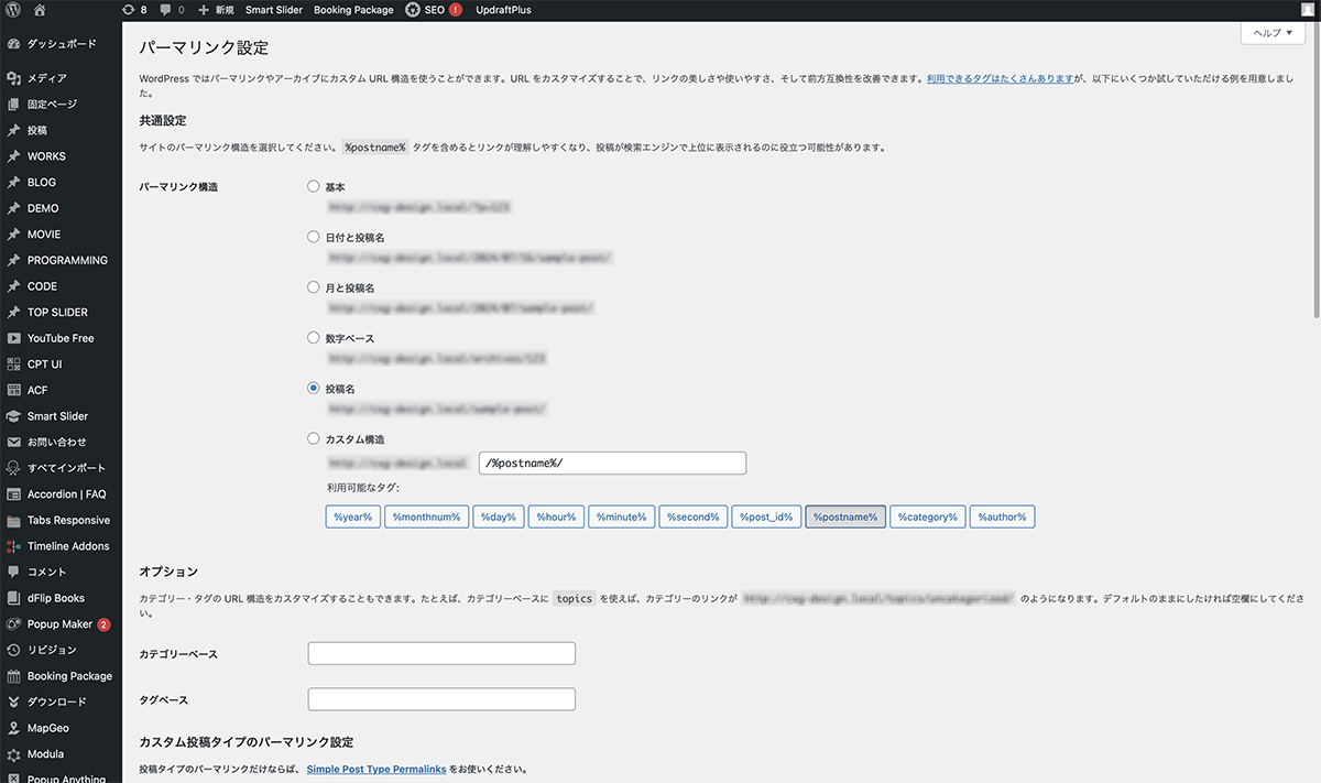 プラグインをインストール、有効化します。左サイドメニューの設定>パーマリンクをクリックします。パーマリンク設定が表示されます。下の方にカスタム投稿タイプのパーマリンク設定が表示されています。