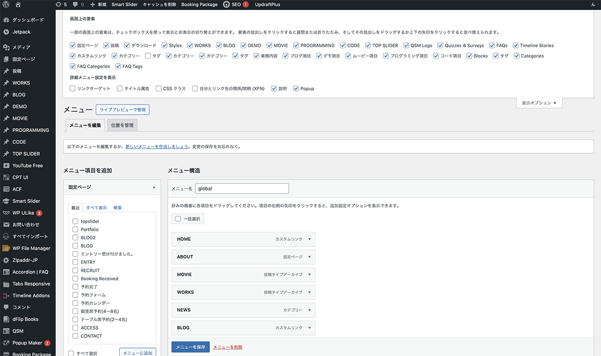 左サイドメニューの外観>メニューをクリックし、メニュー設定画面が表示します。上の表示オプションをクリックして、詳細メニュー設定を表示>説明にチェックを入れます。メニュー構造のメニュー項目をクリックすると、説明が表示されます。ここに、キャプションを入力し、メニューを保存をクリックます。プレビューで確認します。