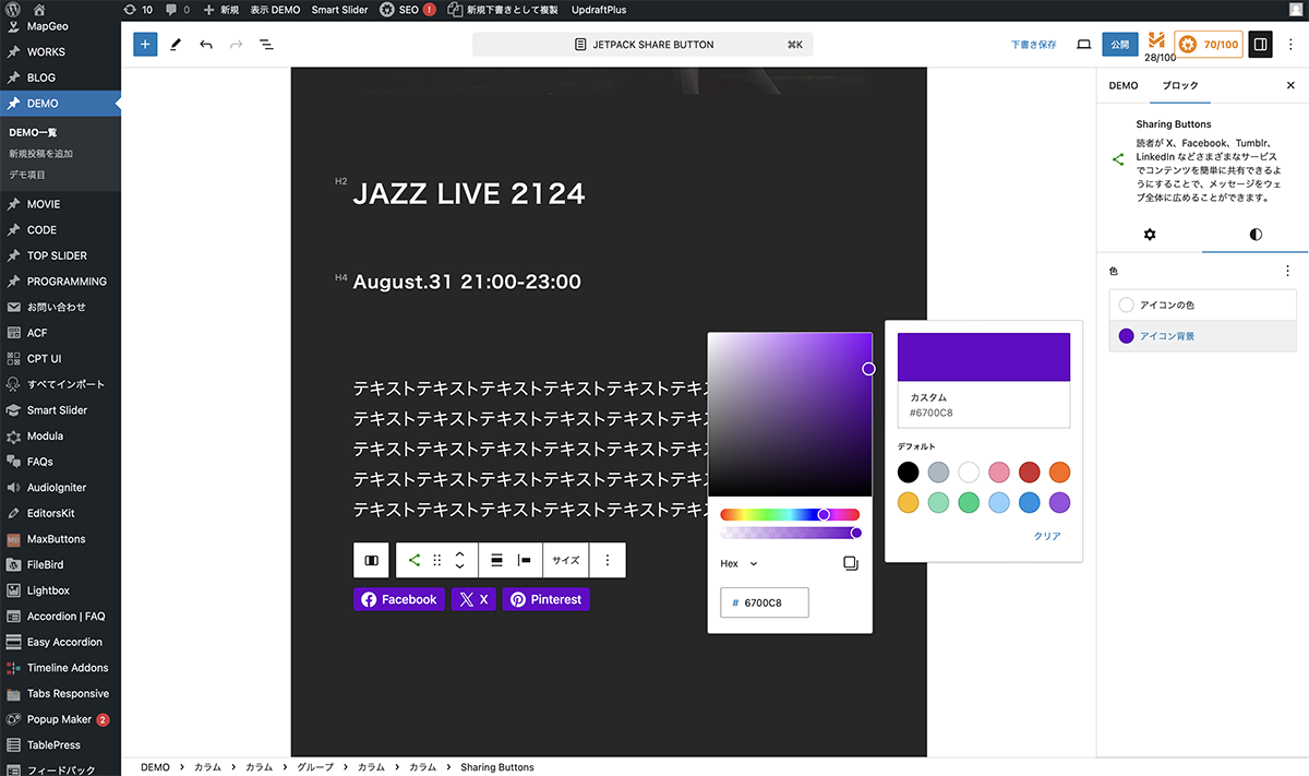 右サイドバーのブロック>Sharing Buttons>スタイルから、アイコンの色を白に、アイコンの背景を紫に設定します。これで完成です。プレビューを確認します。