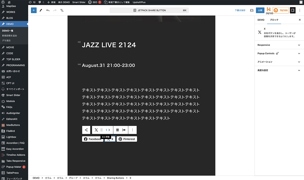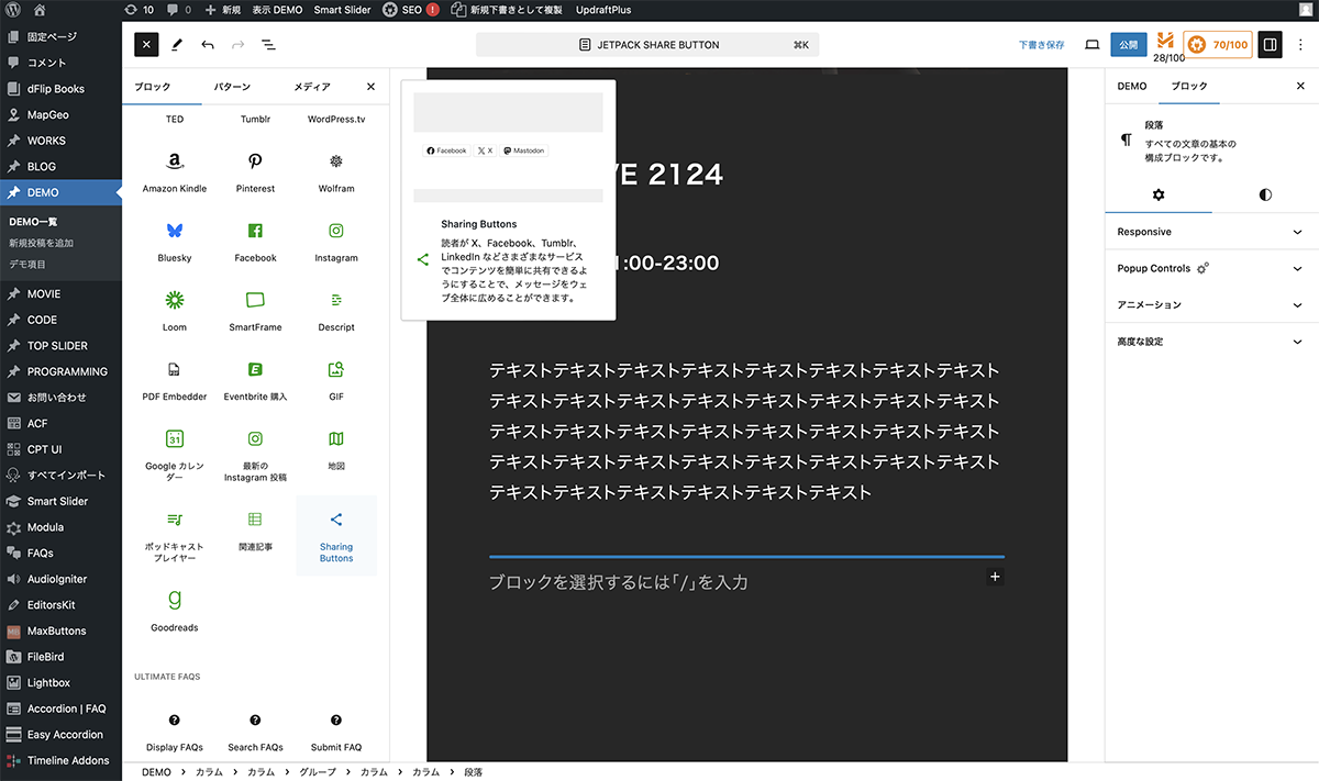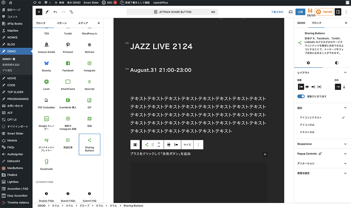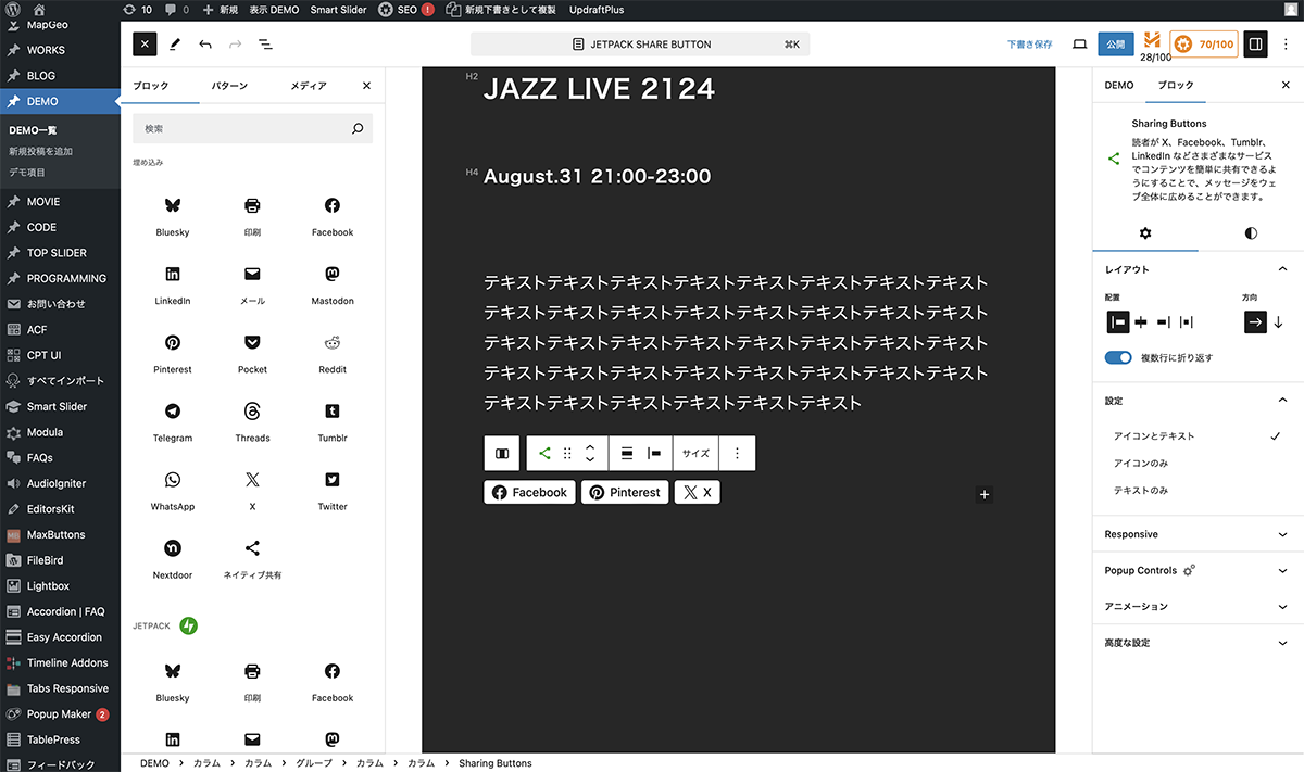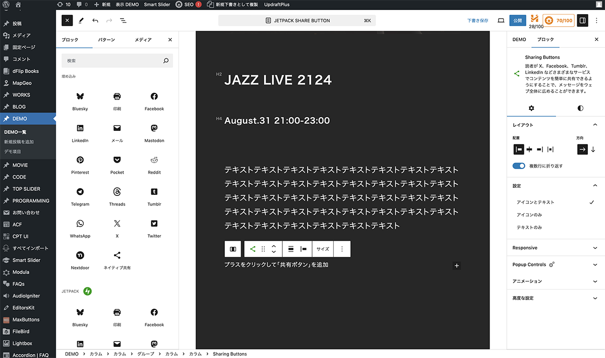 Jetpackで、ブロックエディターで設置できるシェアボタンを実装