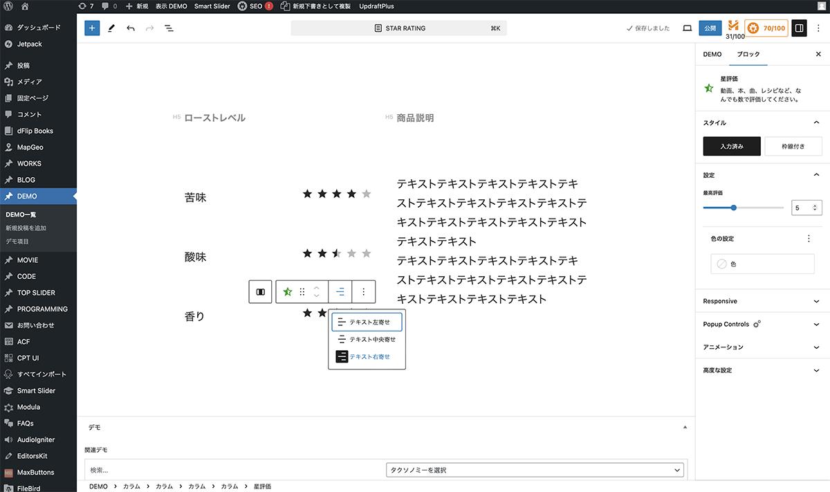 ブロック>ウィジェット>星評価ブロックを設置します。星の値の場所をクリックします。星は半分単位で設定です。星評価をすべて設定し、テキスト右寄せに設定します。プレビューを確認します。