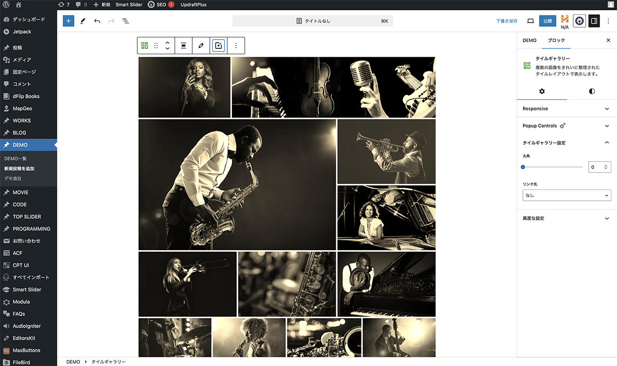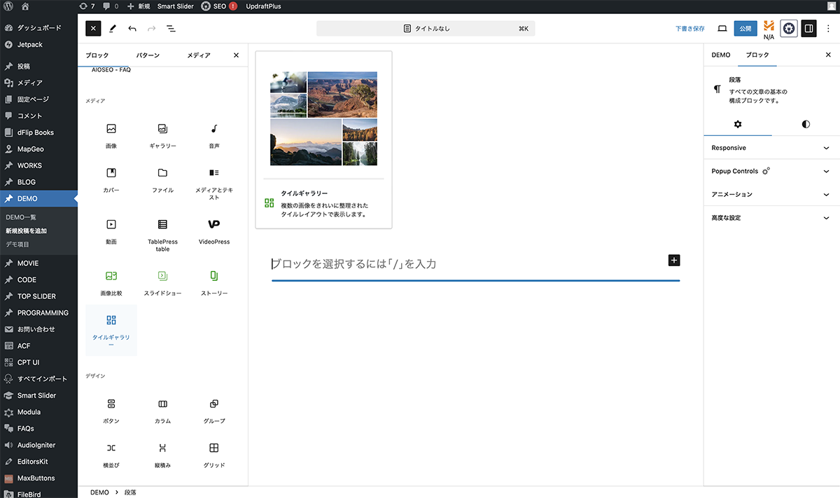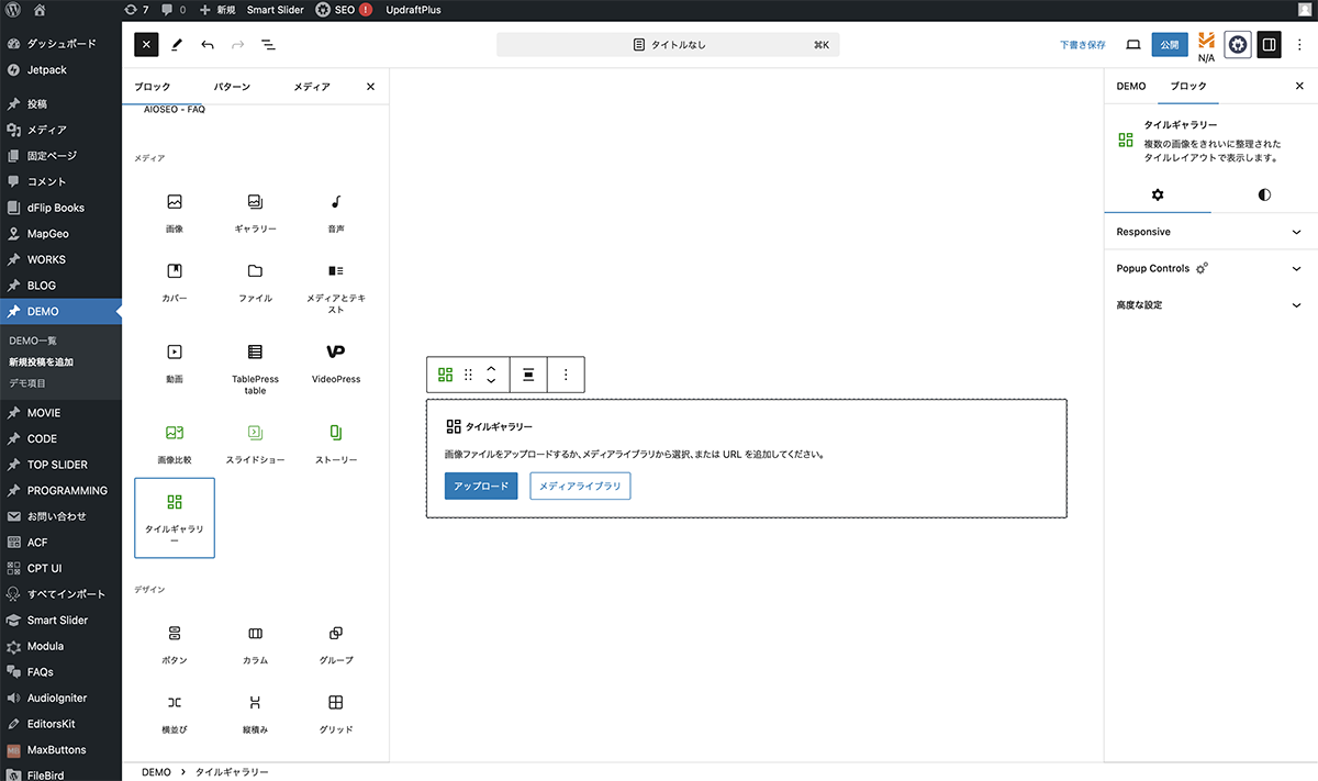 プラグインを、インストール、有効化します。ブロックエディターのメディア>タイルギャラリーをクリックします。ブロックが挿入されるので、メディアライブラリボタンをクリックします。