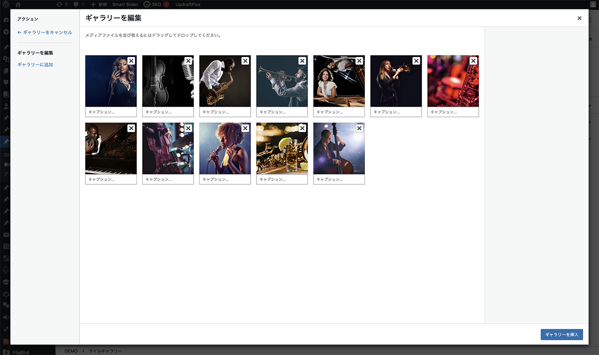 メディアライブラリからギャラリーに入れる画像を選択し、ギャラリーを作成をクリックします。ドラッグ&ドロップで並び替えして、ギャラリーを挿入をクリックします。ギャラリーが作成されます。