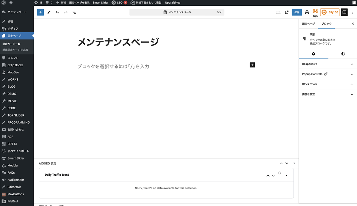固定ページ>固定ページ一覧をクリックします。メンテナンスページが表示されるので、開きます。カミングスーンのページが表示されます。