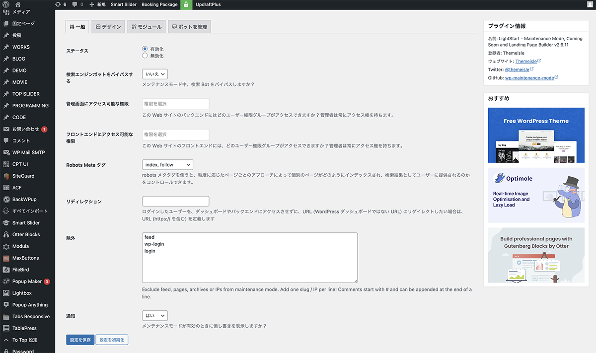 まず、この時点でメンテナンスモードが有効化されるので無効化します。LightStart>LightStartをクリックし設定画面を表示します。ステータスを無効化に設定し、設定を保存ボタンをクリックします。