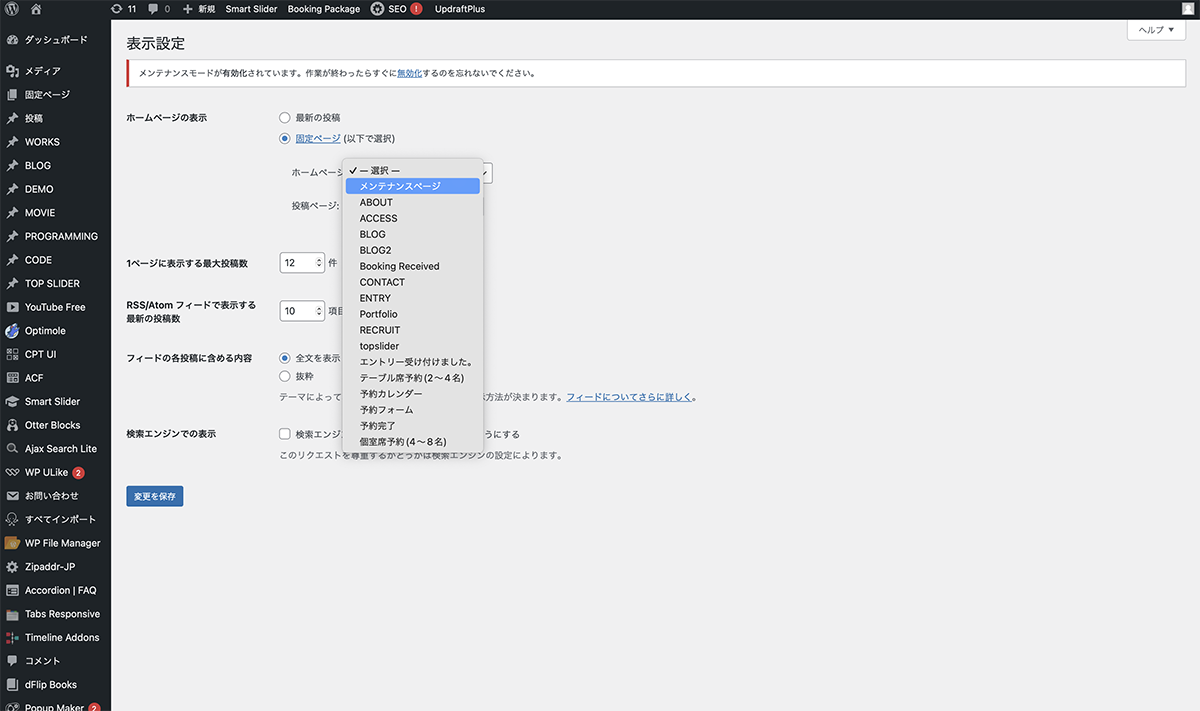 左サイドバーの設定>表示設定をクリックします。ホームページの表示を固定ページに設定します。セレクターから、メンテナンスページを選択します。設定を保存ボタンをクリックします。これで、設定完了です。