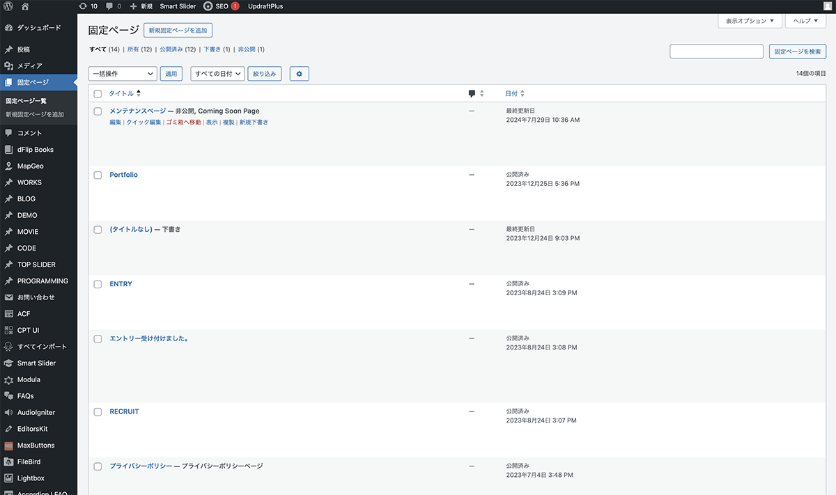 固定ページ>固定ページ一覧をクリック