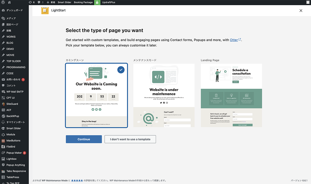 プラグインをインストール、有効化します。Select the type page you want画面が表示されるので、カミングスーンを選択してContinueボタンをクリックします。