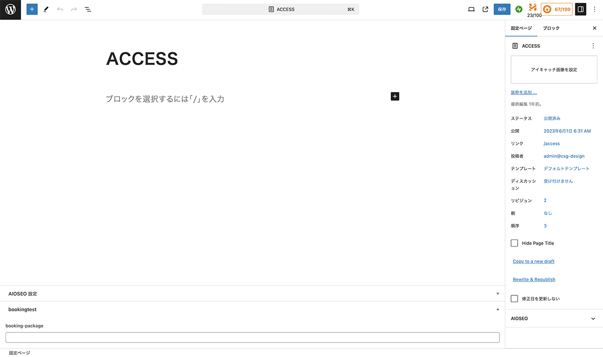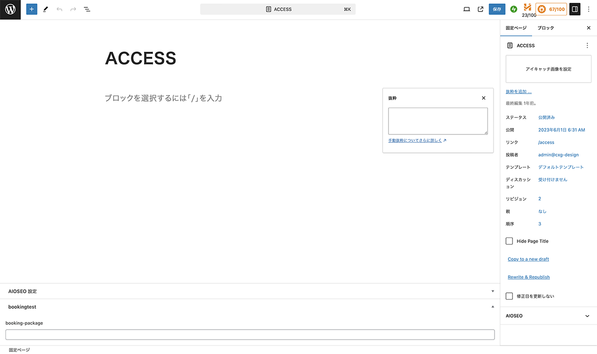 固定ページのACCESSを開きます。右サイドバーに抜粋を追加…が表示されます。クリックするとテキストボックスが表示されます。ここに入力したものが、反映されていたら完成です。