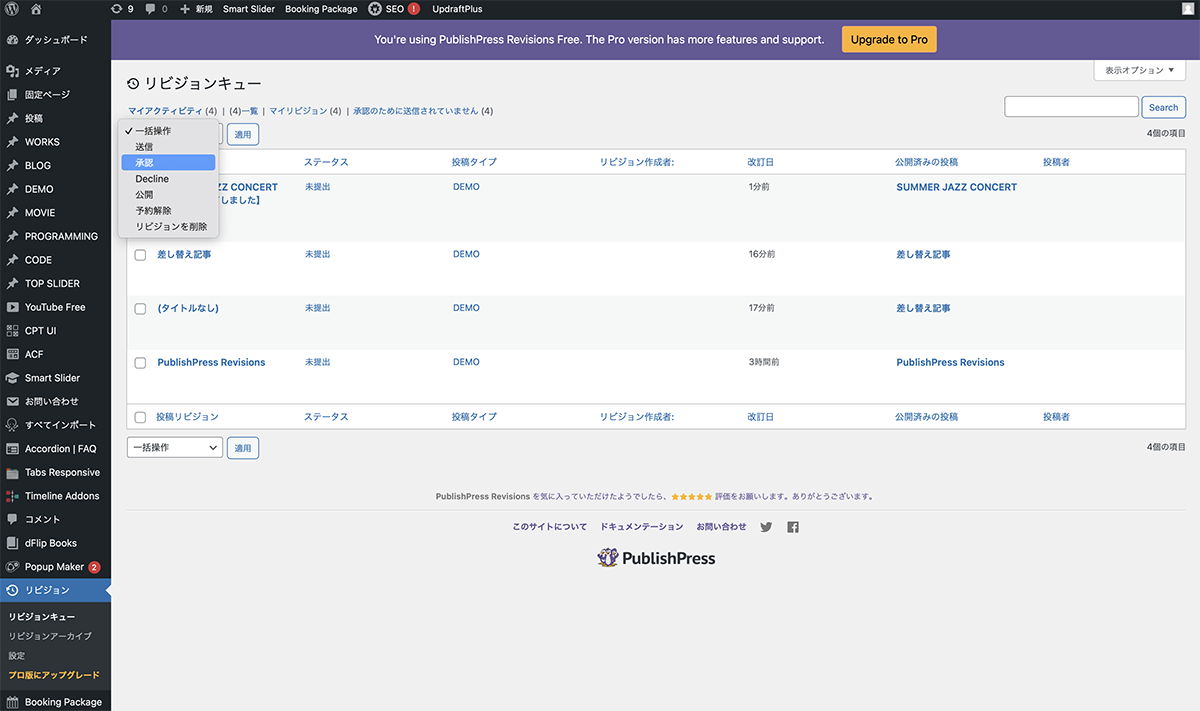 チェックボックスにチェックを入れ、上のセレクトボックスから、承認を選択し、適用をクリック