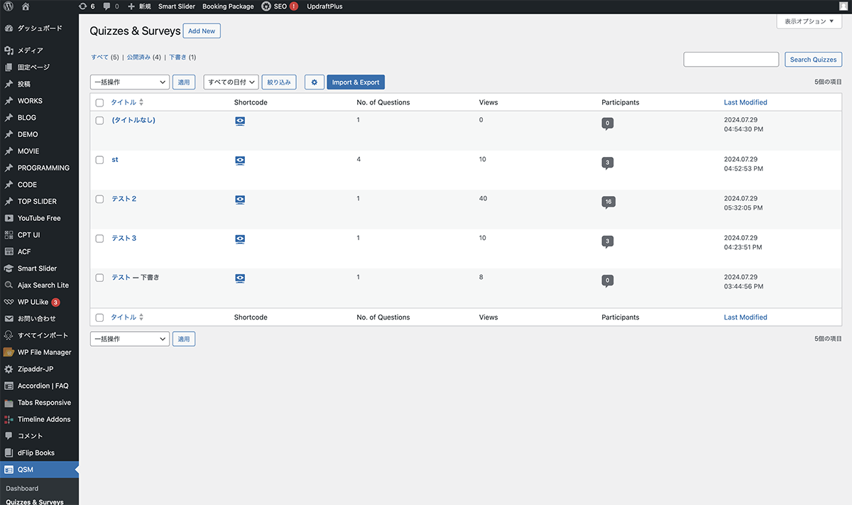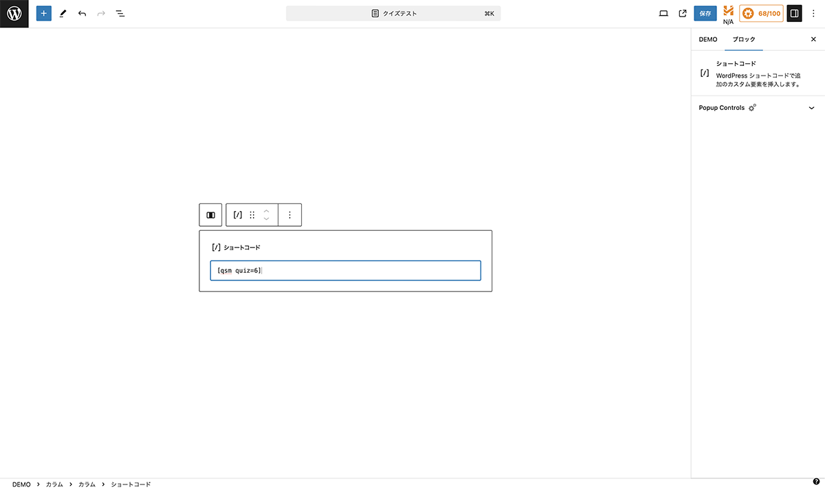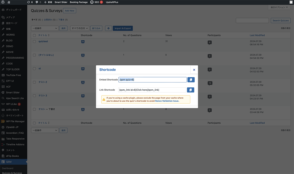 サイドメニューのQSMQuizzes & Surveysをクリックします。設置するクイズのShortcodeマークをクリックします。ポップアップで表示されるショートコードコピーします。ブロックエディターの編集画面にショートコードブロックを配置し、ペーストします。