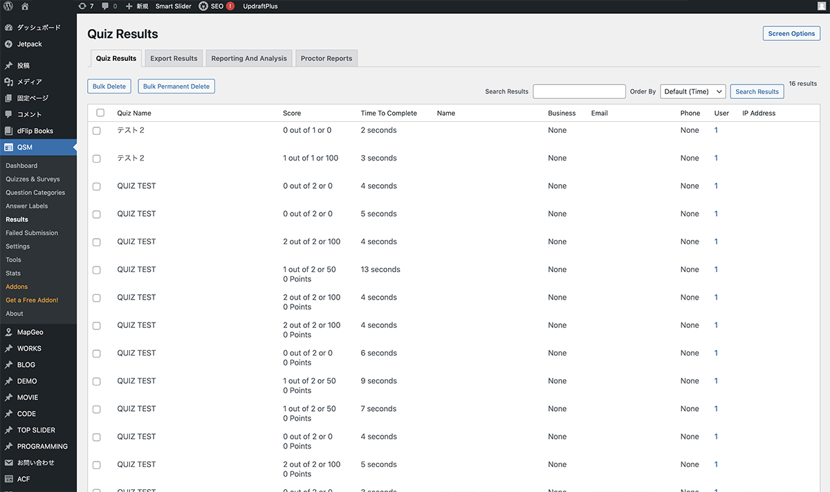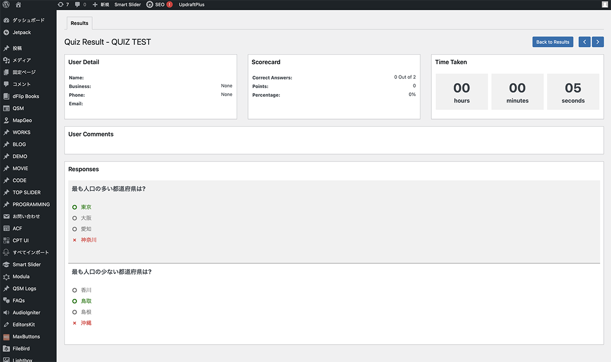 QMS>Resultsをクリックします。解答された結果一覧が表示されます。それぞれの結果をクリックすると、詳細画面が表示されます。