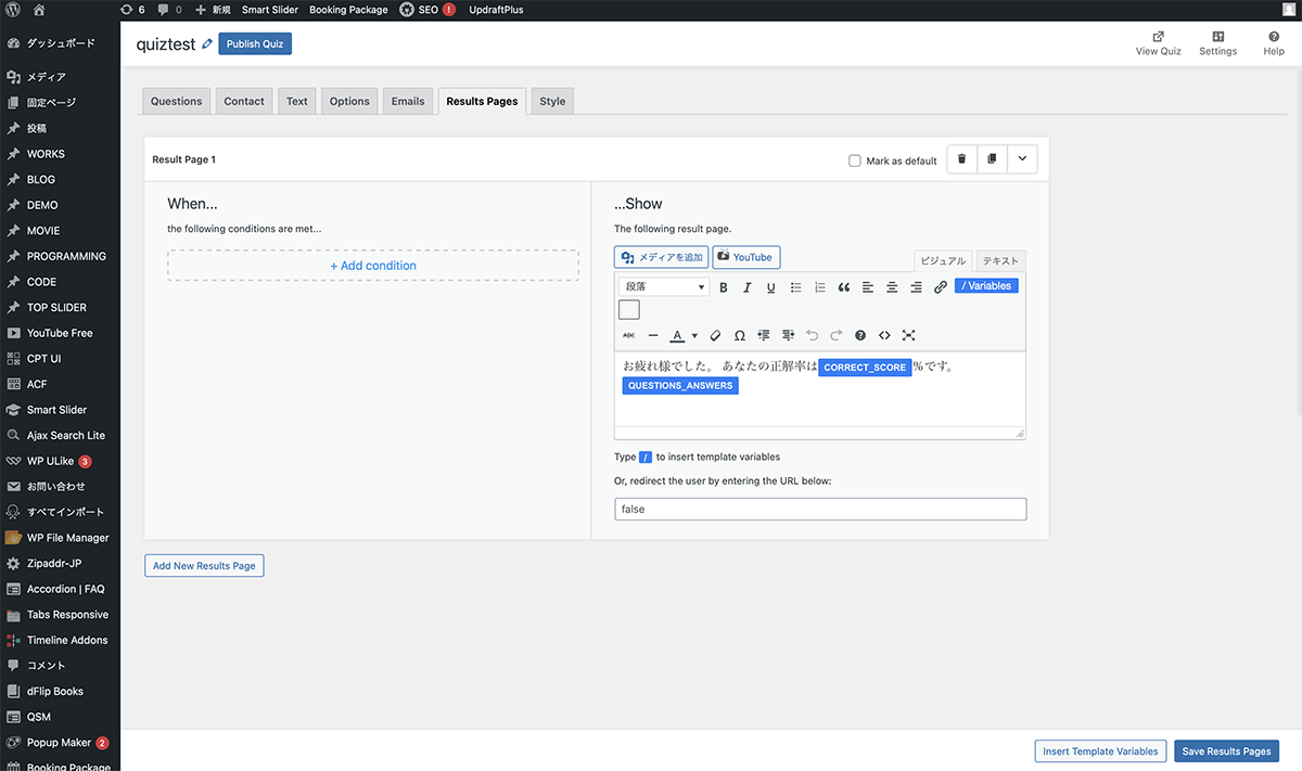 …Showの、クラシックエディター内を変更します。解答後のページの内容が変更されます。Save Results Pagesをクリックし、保存します。