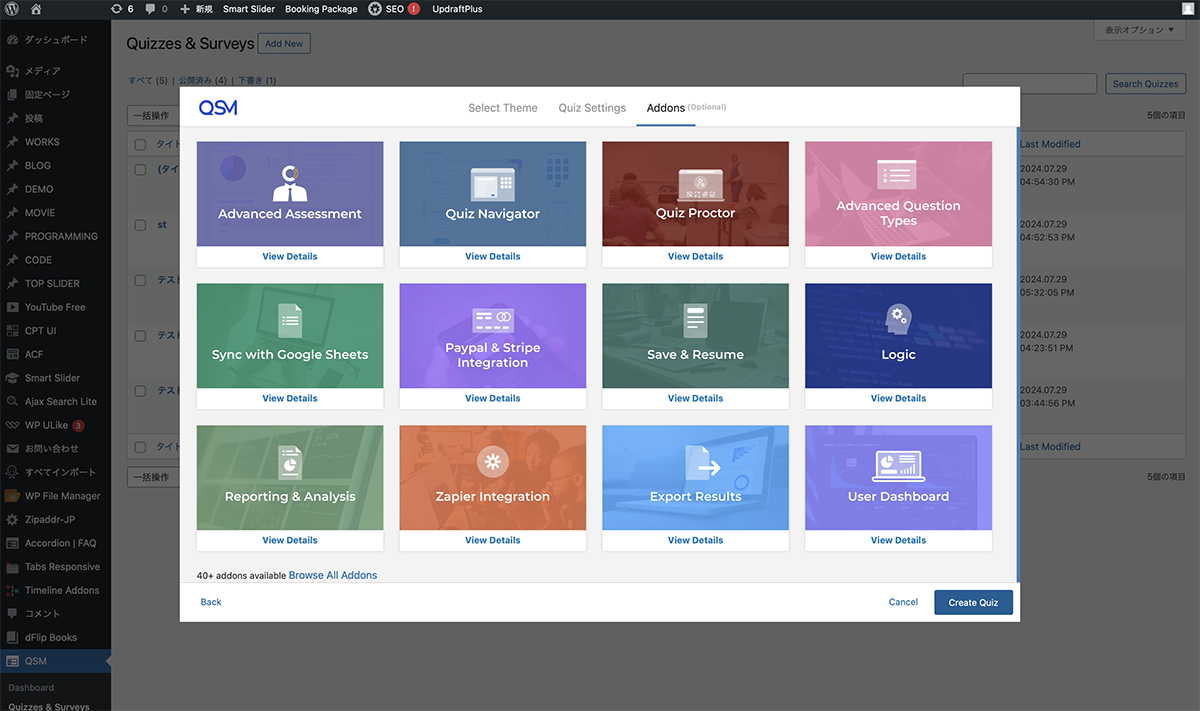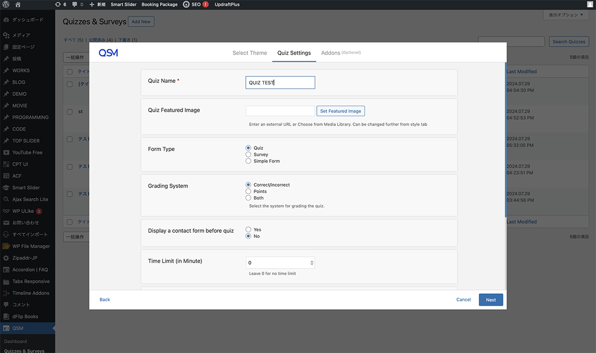 プラグインをインストール、有効化します。Select Themeは、Default Themeを選択し、Nextボタンをクリックします。Quiz Settingsは、Quiz Nameに任意の名前を入力し、Nextボタンをクリックします。Addonsは、何もせず、Create Quizボタンをクリックします。