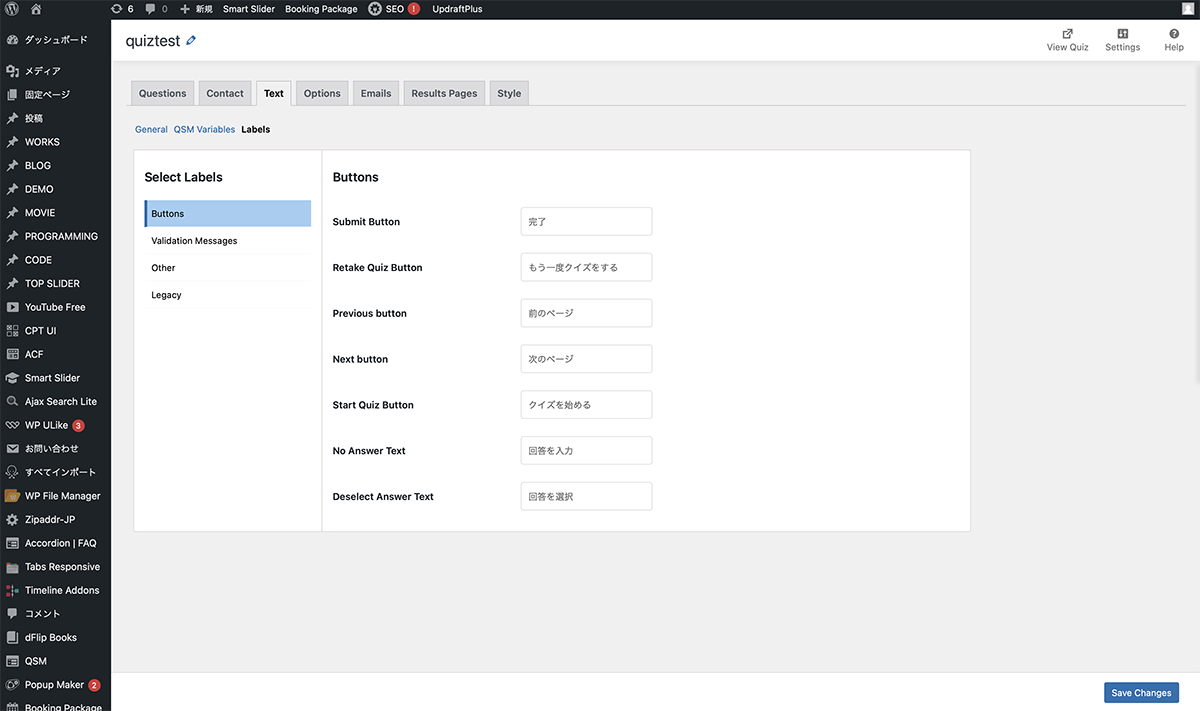 LabelsSelect LabelsButtonsの内容を変更します。これで、クイズのボタンのテキストなどが変更されます。Save Changesをクリックし、保存します。