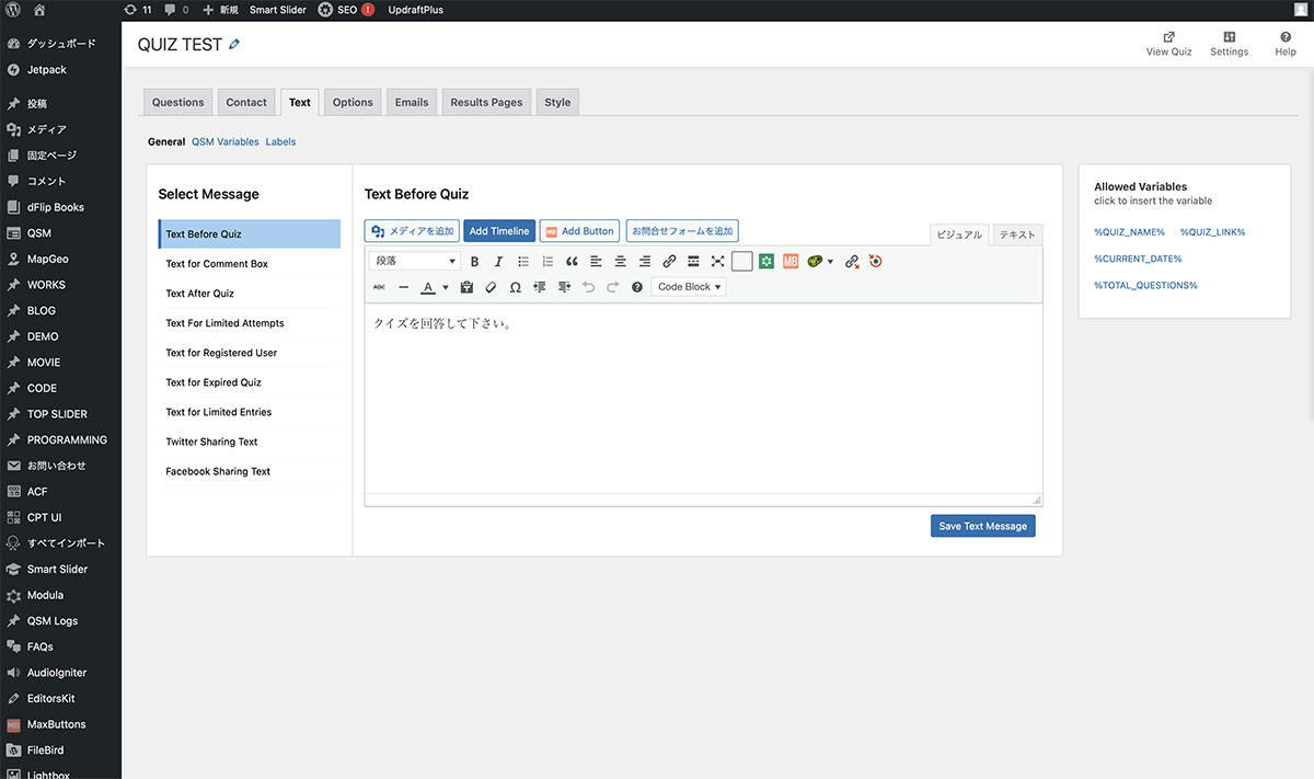 GeneralTest Before Quizの内容を変更します。クイズの前のテキストが変更されます。Save Text Messageをクリックし、保存します。