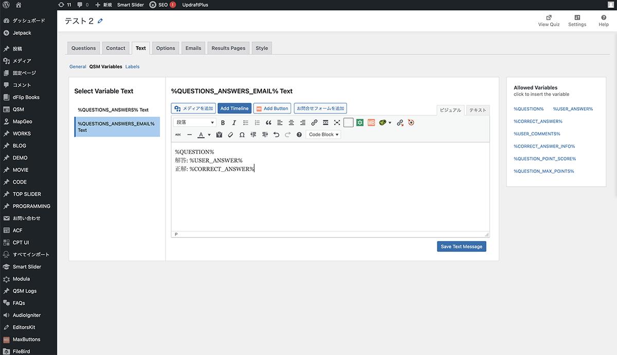 QSM Variables%QUSETIONS_ANSWER_EMAIL% Textクラシックエディター内を変更します。送信されるメールの内容が変更されます。Save Text Messageをクリックし、保存します。