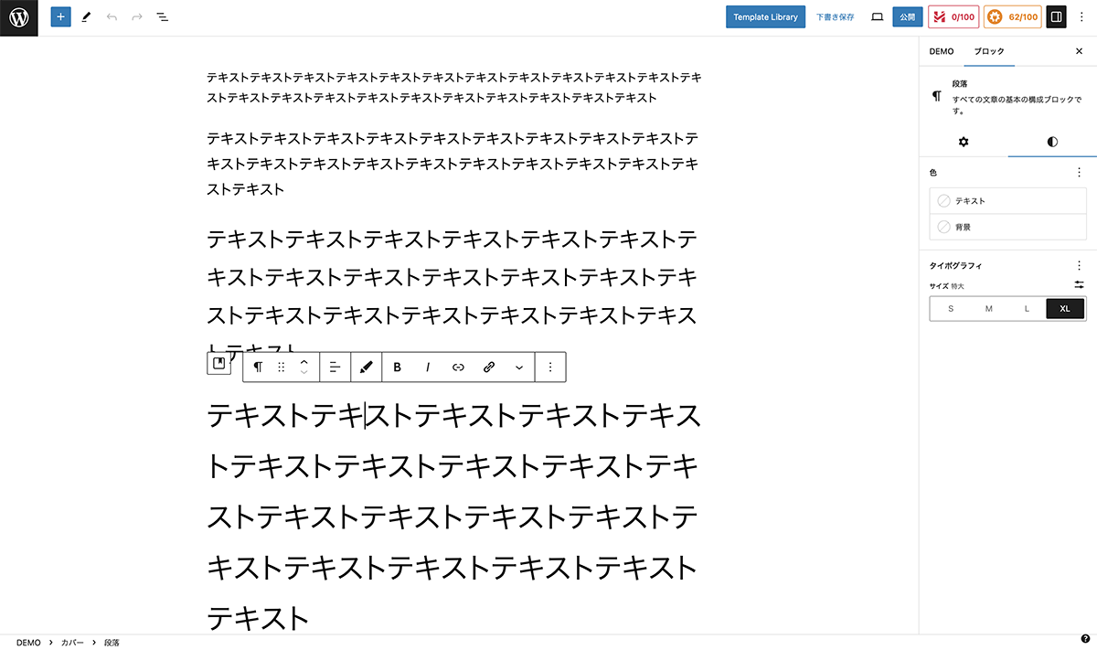 設定が反映されているか確認します。編集画面で、4つの段落ブロックを作成し、文字を入力します。ブロックエディター上のフォントサイズが変更されているか確認します。次に、プレビュー画面で、実際に同じようにサイズが変更されているか確認します。