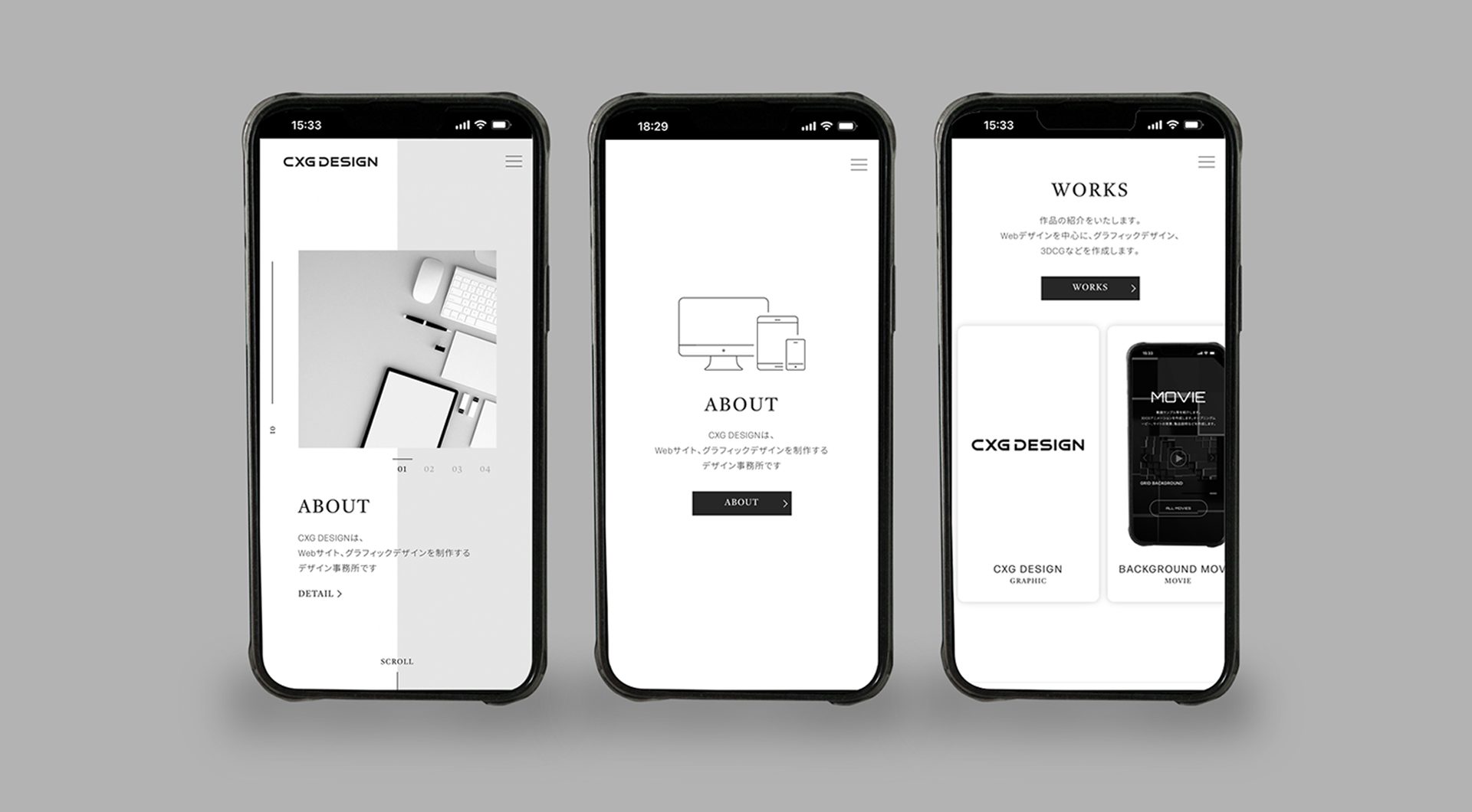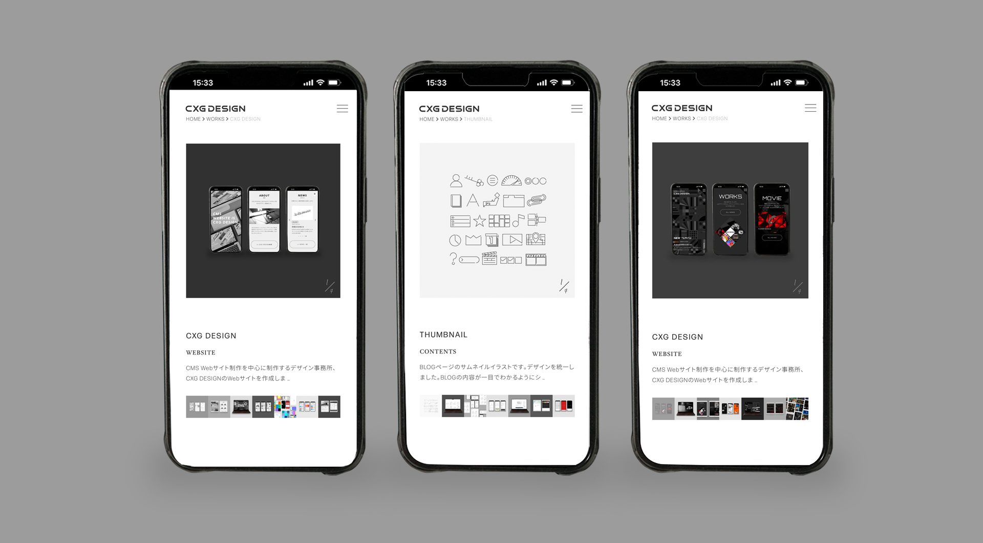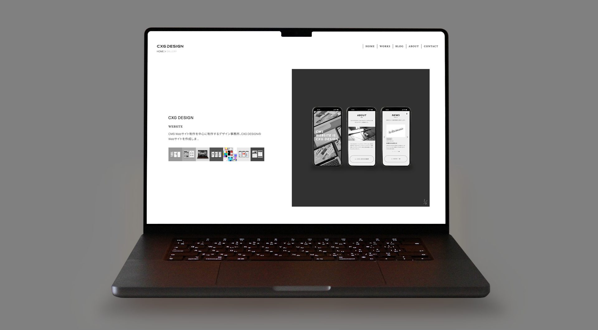 CMS Webサイト制作を中心に制作するデザイン事務所、CXG DESIGNのWebサイトを作成しました。レスポンシブデザイン、CMSサイトです。全体的にモノトーンでシンプルに、デザインしました。NEWSはCMS機能になっており、作品、事務所について、休業日など、スマホやPCより更新できるようになっております。
