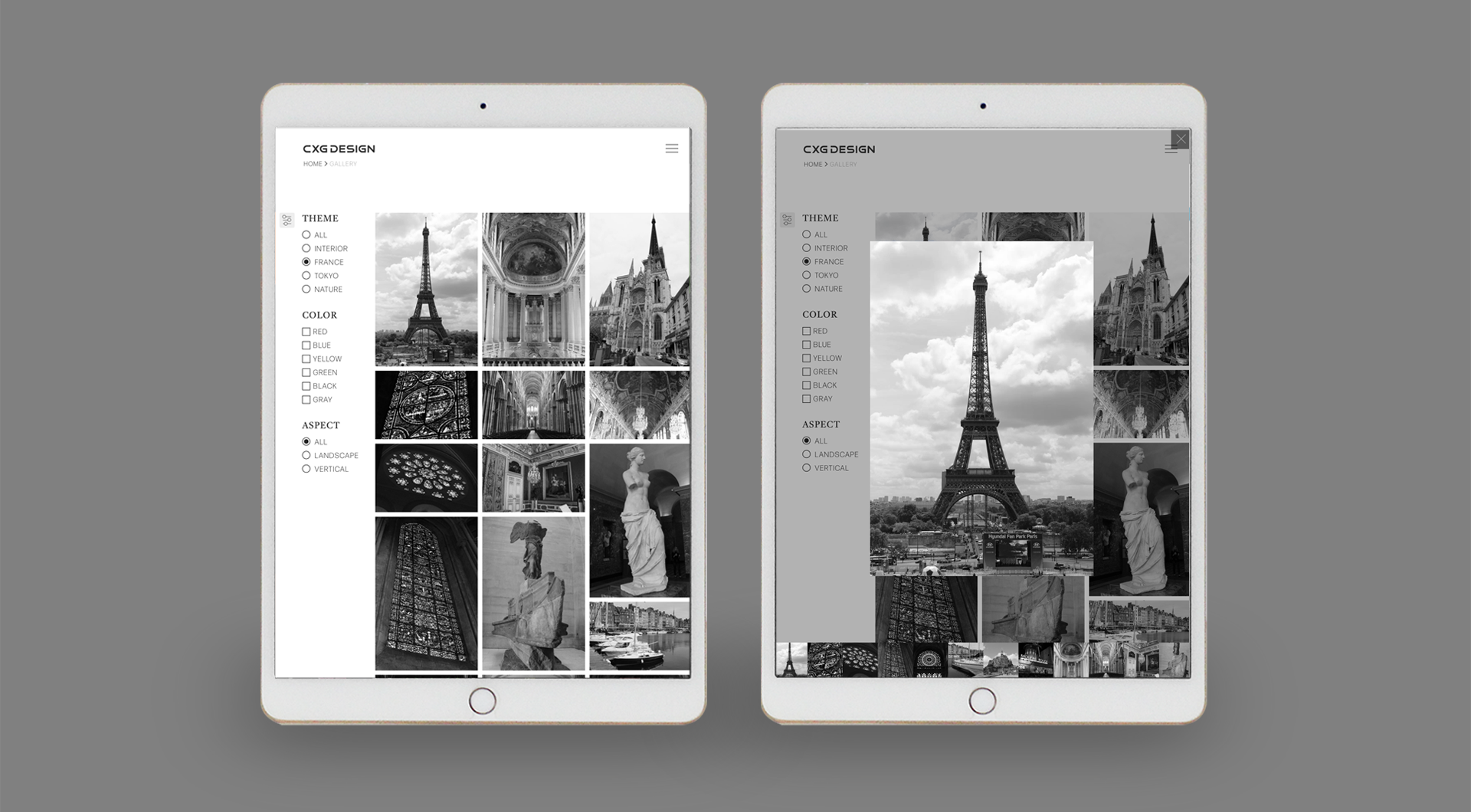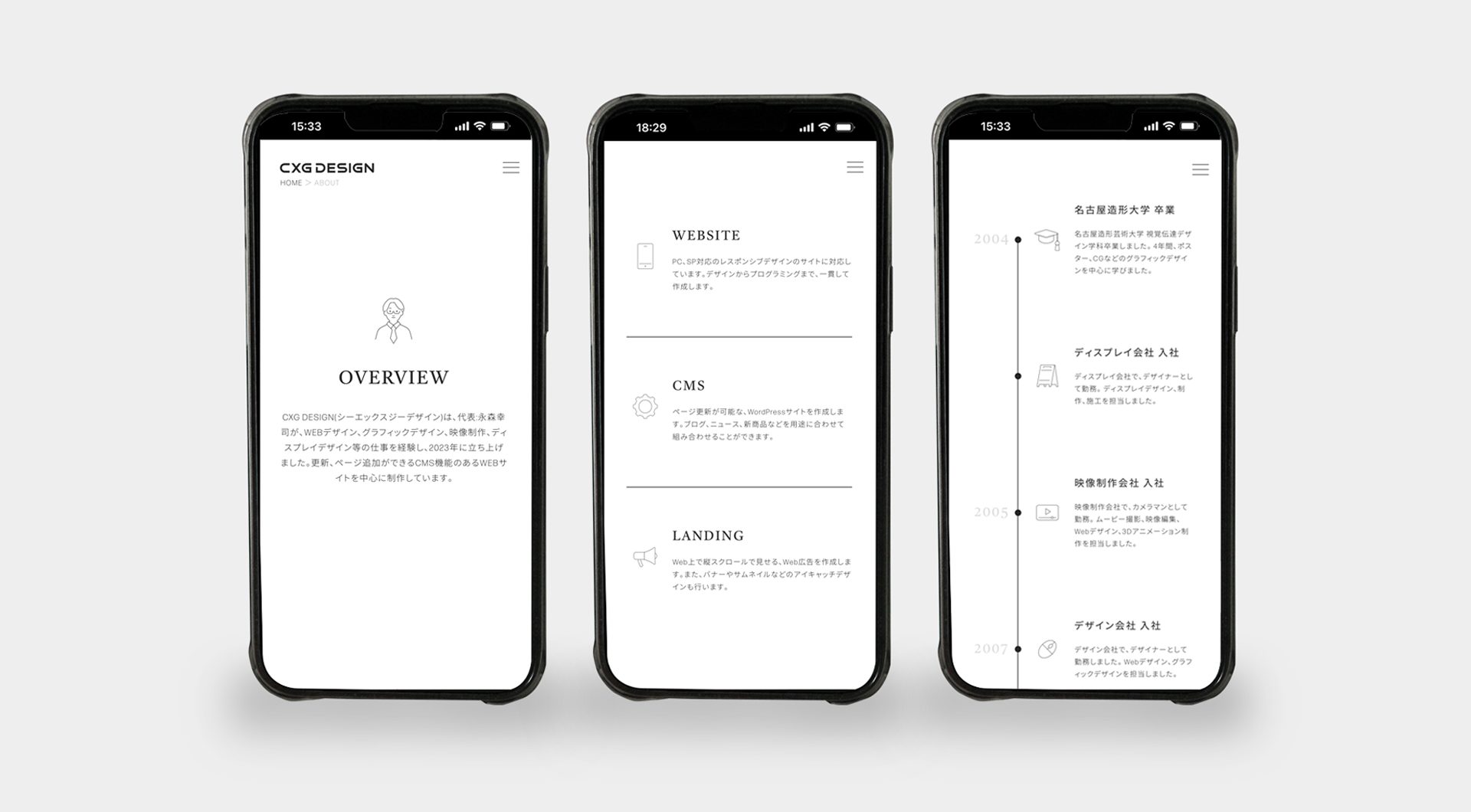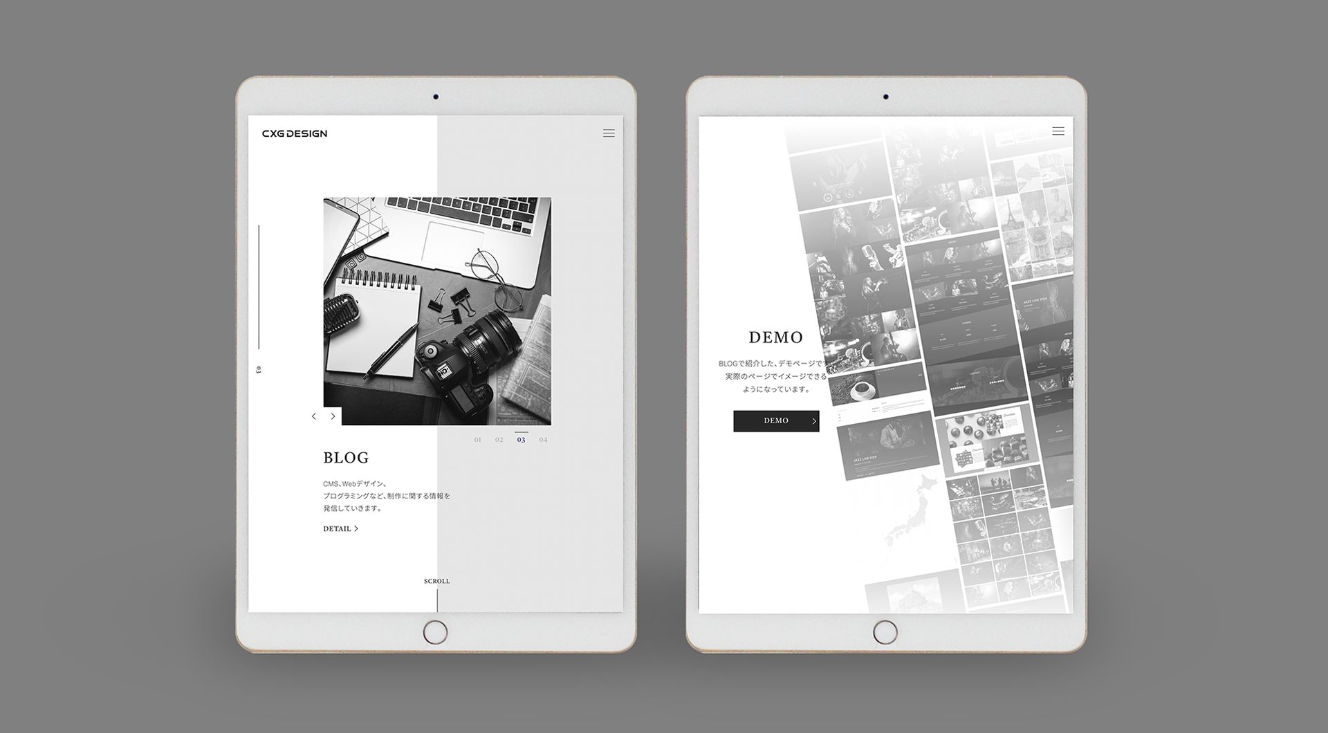 CMS Webサイト制作を中心に制作するデザイン事務所、CXG DESIGNのWebサイトを作成しました。レスポンシブデザイン、CMSサイトです。全体的にモノトーンでシンプルに、デザインしました。NEWSはCMS機能になっており、作品、事務所について、休業日など、スマホやPCより更新できるようになっております。
