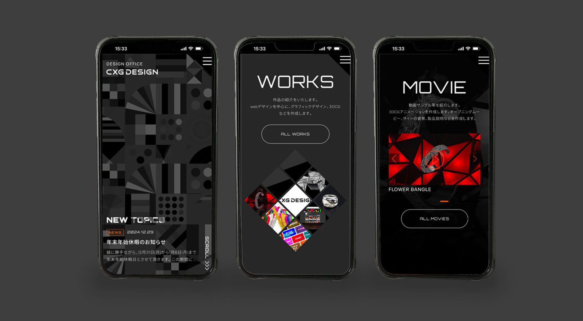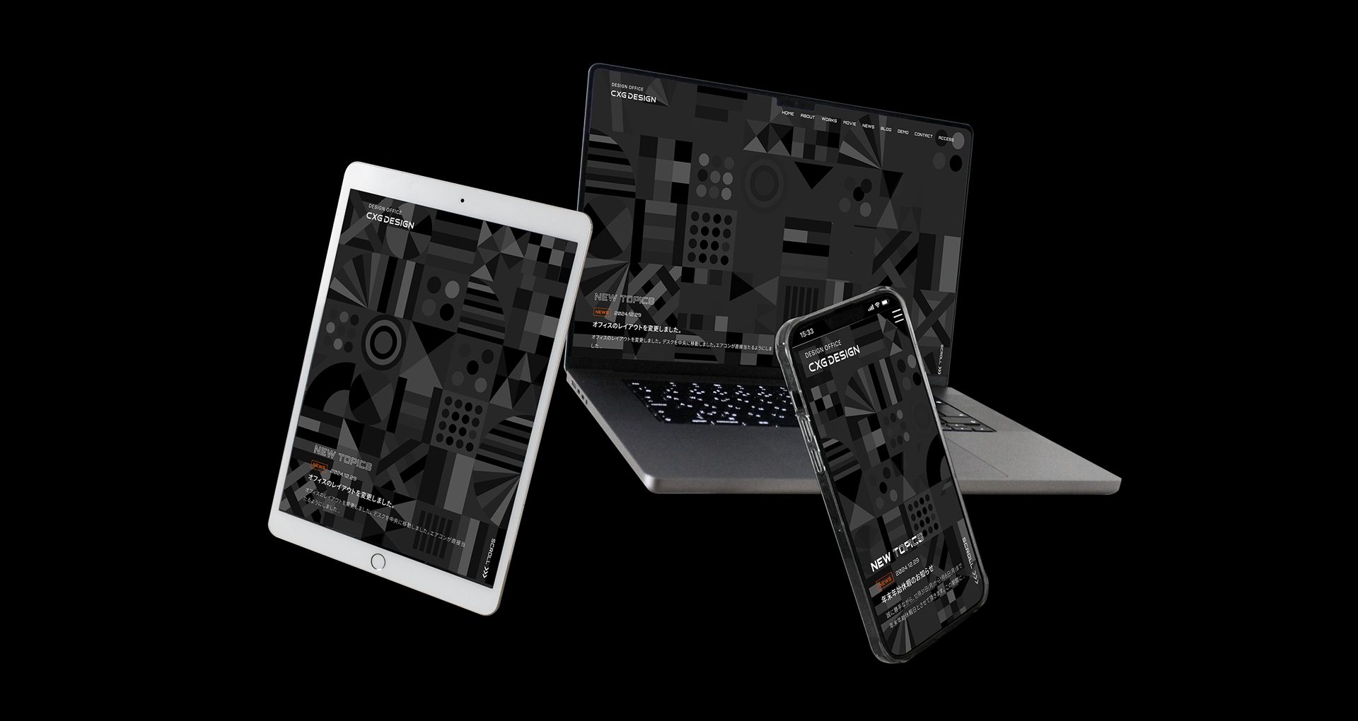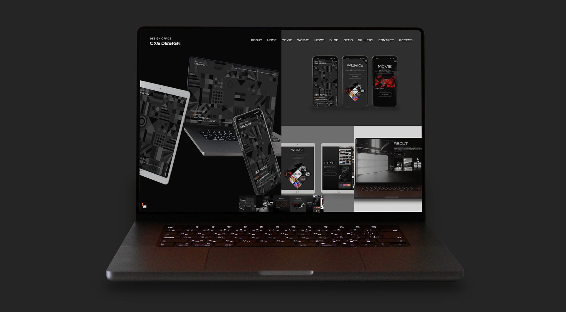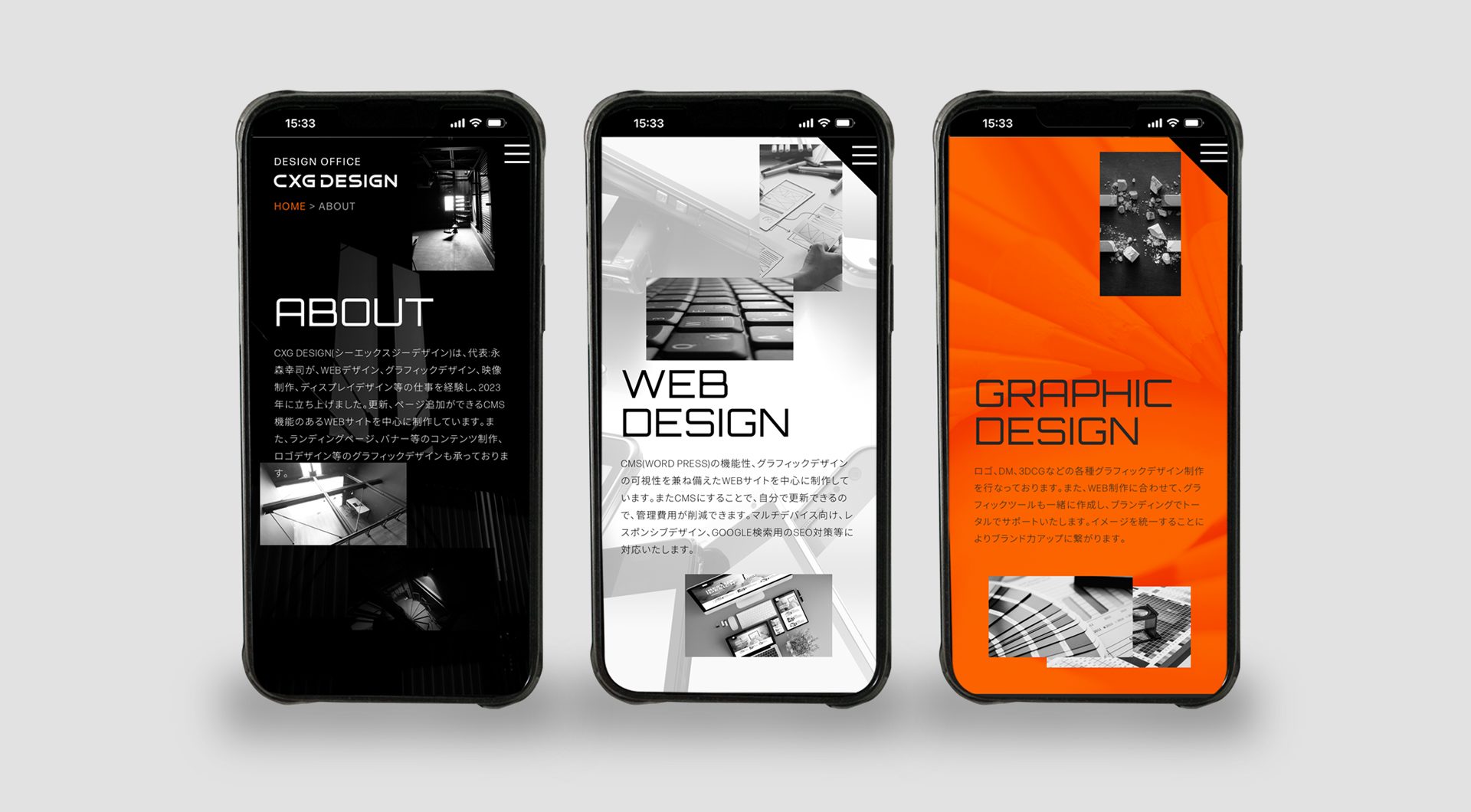 CMS Webサイト制作を中心に制作するデザイン事務所、CXG DESIGNのWebサイトを作成しました。レスポンシブデザイン、WordPressサイトです。全体的にダークグレーで統一して、アクセント色で、オレンジを使用しました。